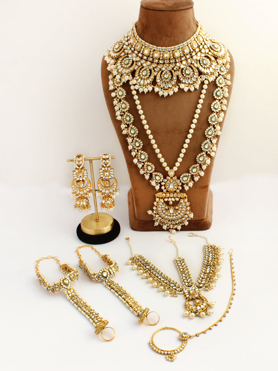 Radiant Beauty for Your Special Day: Emanate radiance with the timeless appeal of this Gold Tone Bridal Set. The simulated Kundan and faux pearls create a harmonious blend, ensuring you shine on your wedding day.