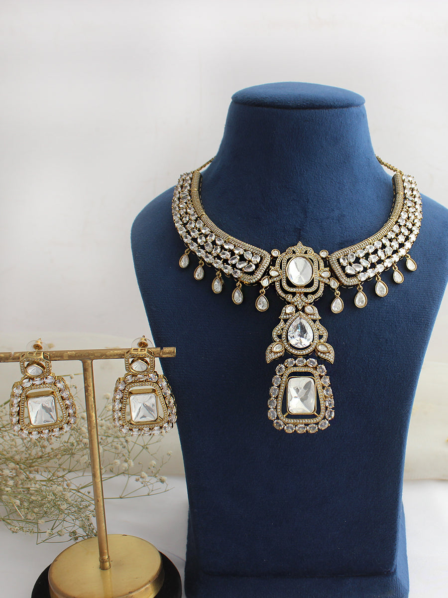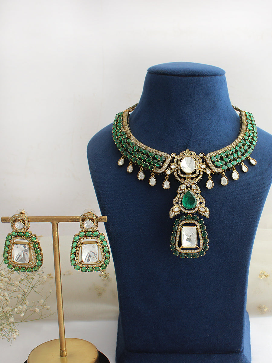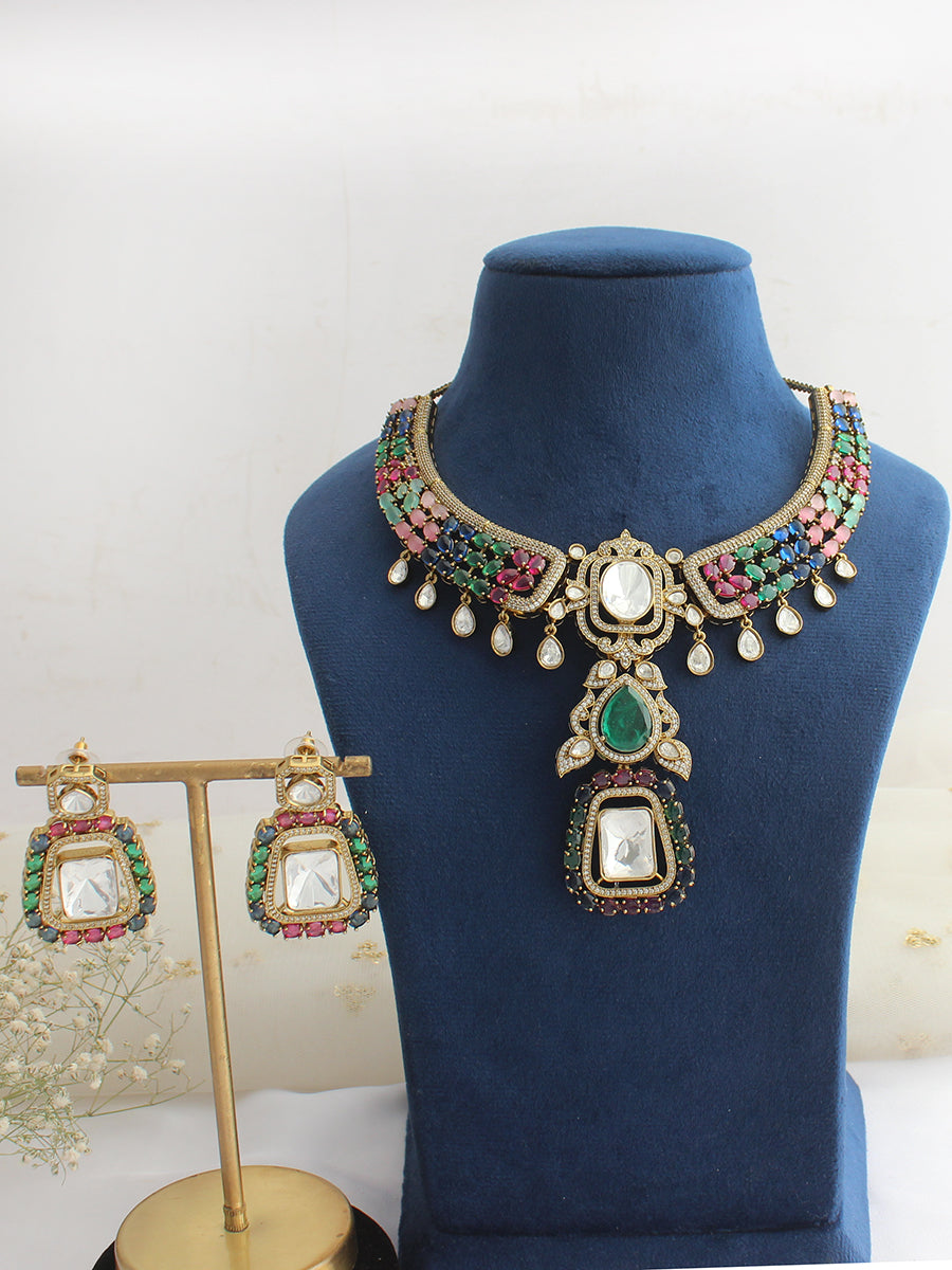 Elevate your style with the Vianshi Necklace Set, a luxurious ensemble designed to radiate sophistication and charm. This exquisitely crafted set features a dazzling combination of simulated moissanite polkis , sparkling CZs, and vibrant colored stone accents, thoughtfully arranged in a timeless design that catches the light from every angle. Perfect for weddings, festive occasions, or special evenings, the Vianshi Necklace Set adds a touch of glamour and elegance to any outfit, ensuring you stand out with effortless grace.