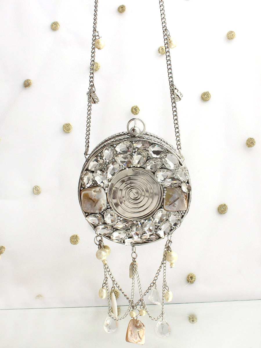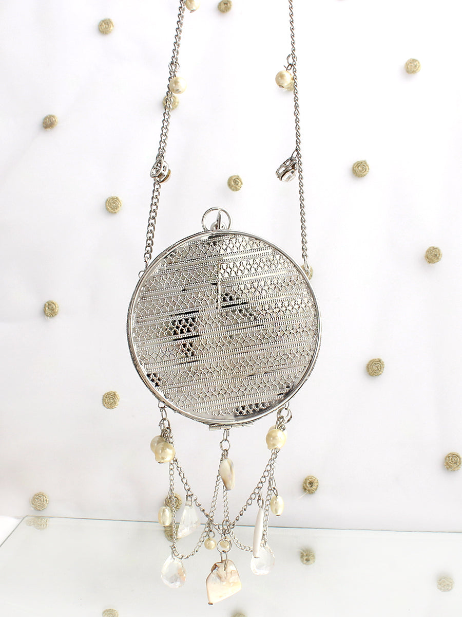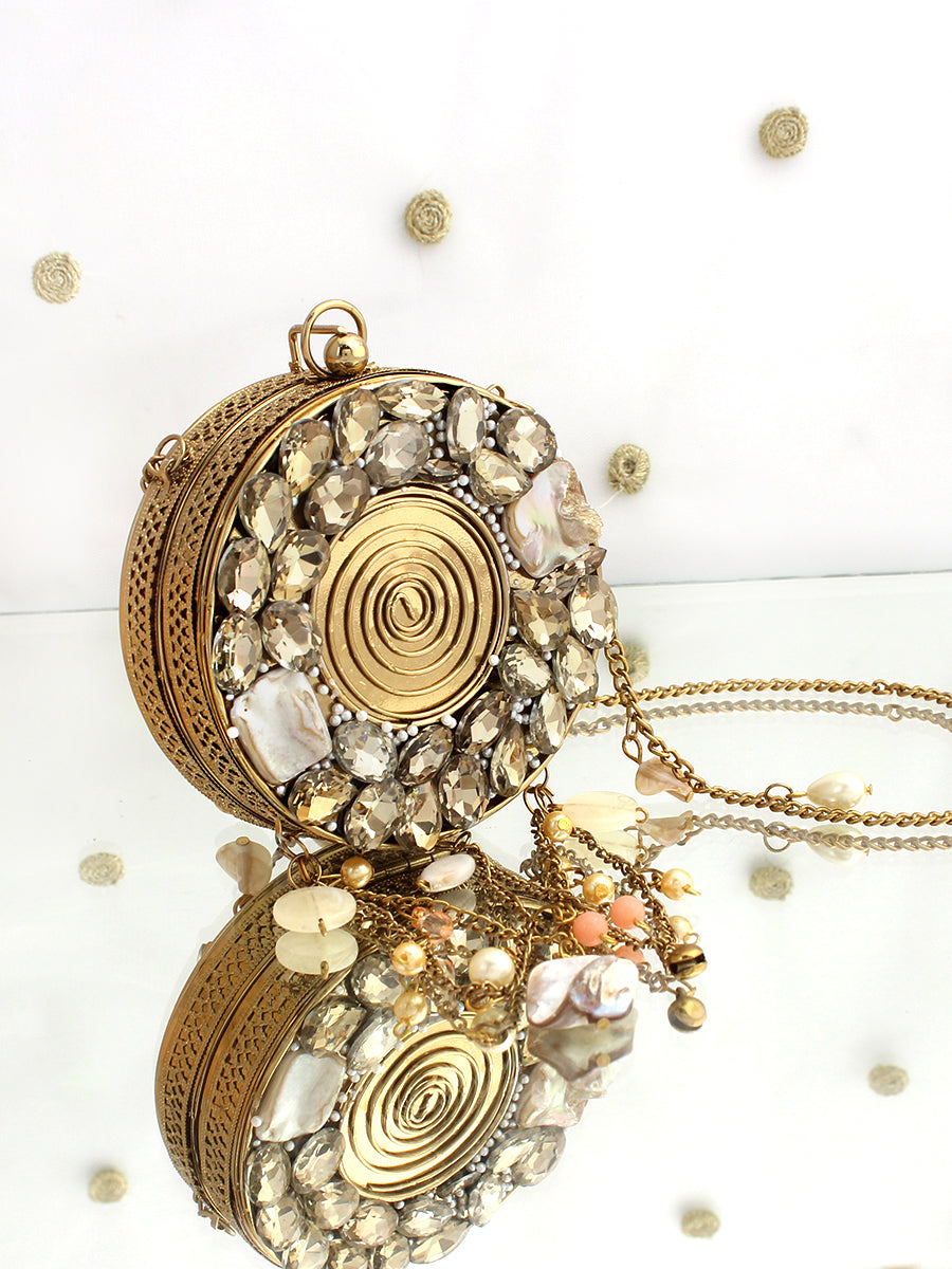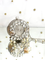 A refined blend of glamour and artistry, this Gold and Silver Metal Round Micro Clutch Bag is designed to make an unforgettable impression. Showcasing a structured round metal silhouette, it is exquisitely embellished with radiant crystal stones and elegant mother-of-pearl shell accents that beautifully reflect the light. The secure clasp closure keeps your essentials safe, while the delicate chain strap allows for effortless carrying. Perfect for weddings, festive celebrations, and elegant evening events, this statement clutch adds timeless sophistication and luminous charm to any ensemble. Designed to carry small essentials such as cards and keys, it is the ideal finishing touch for special occasions.