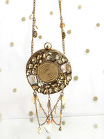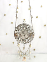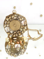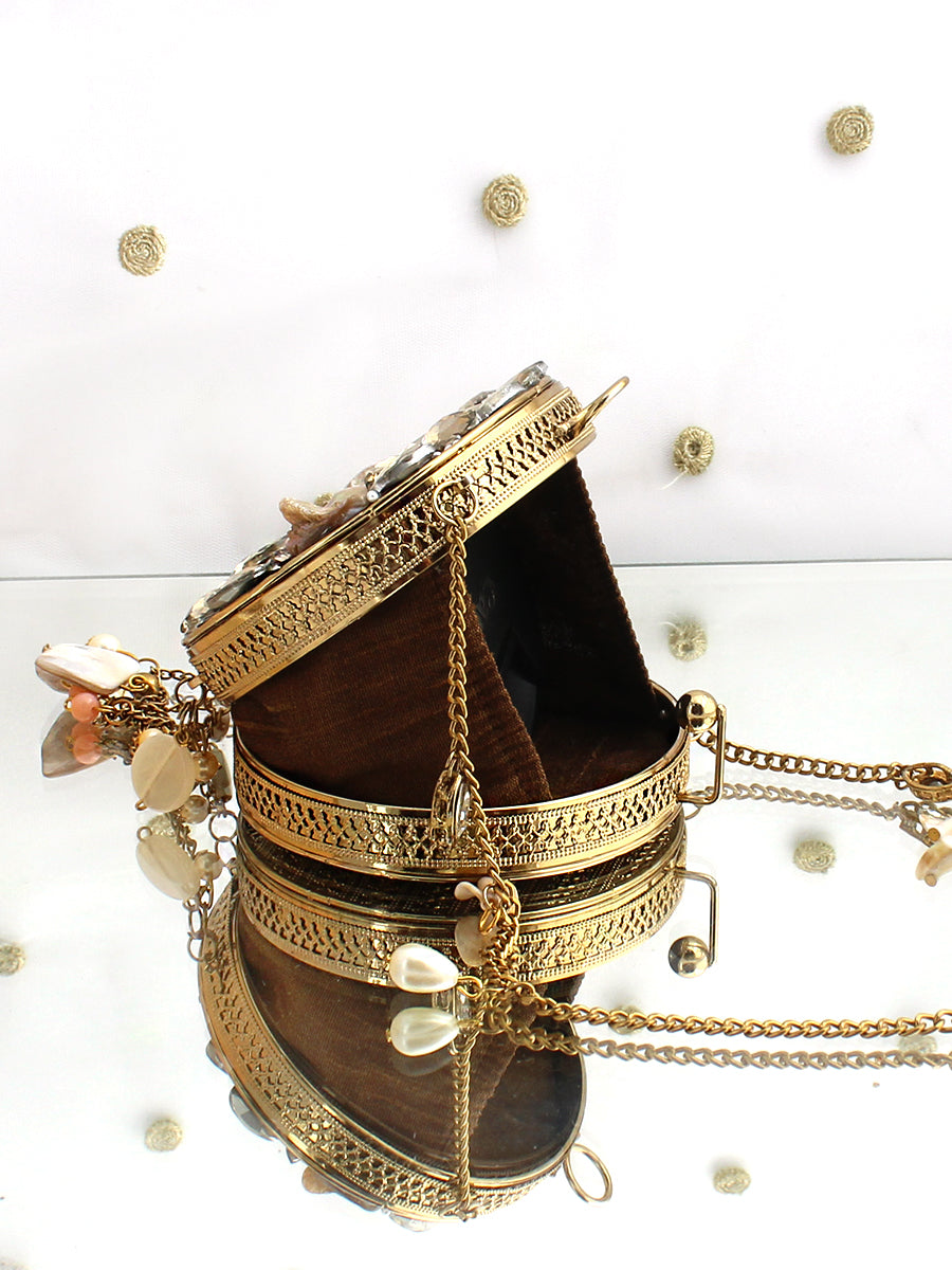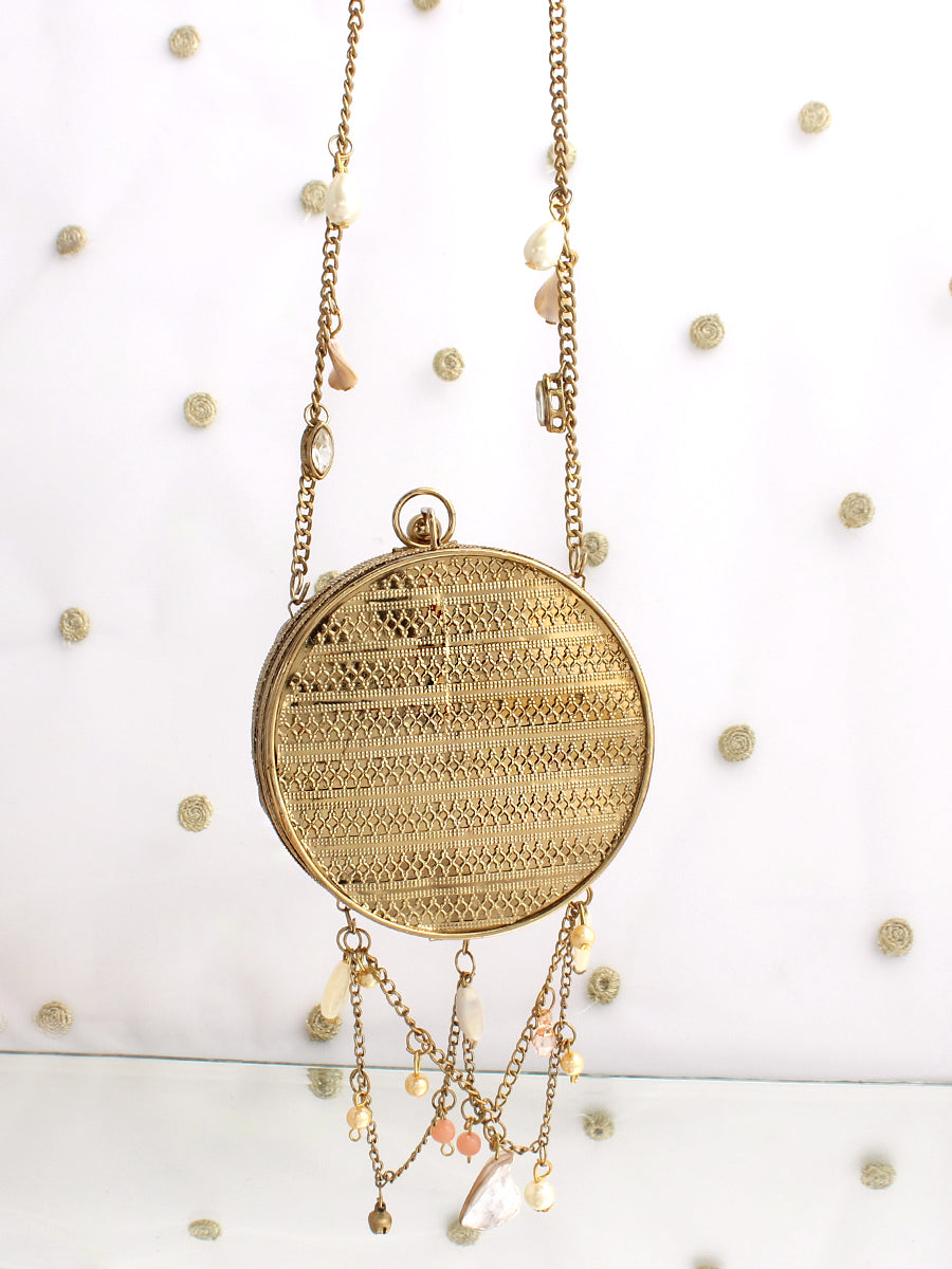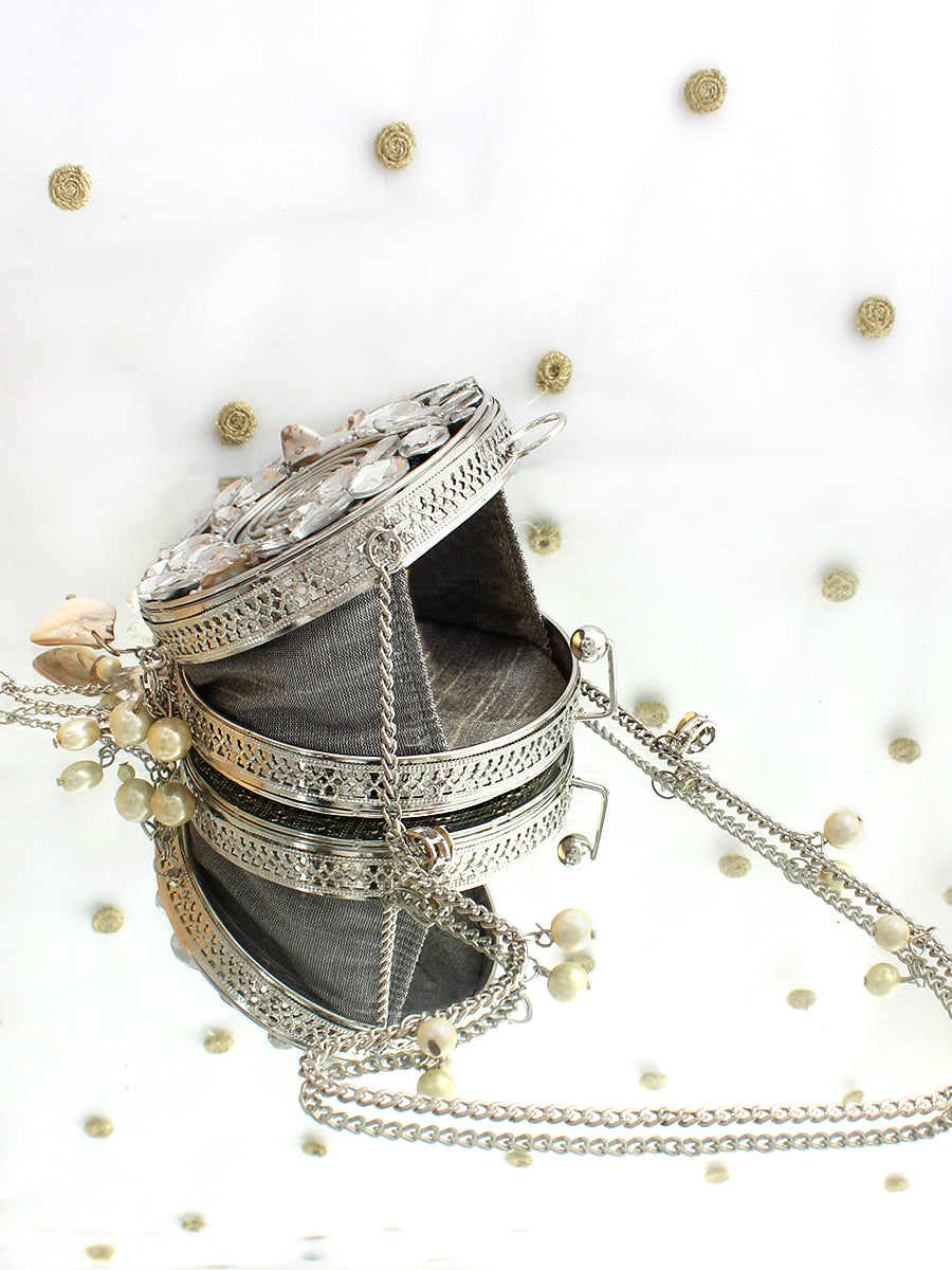 A refined blend of glamour and artistry, this Gold and Silver Metal Round Micro Clutch Bag is designed to make an unforgettable impression. Showcasing a structured round metal silhouette, it is exquisitely embellished with radiant crystal stones and elegant mother-of-pearl shell accents that beautifully reflect the light. The secure clasp closure keeps your essentials safe, while the delicate chain strap allows for effortless carrying. Perfect for weddings, festive celebrations, and elegant evening events, this statement clutch adds timeless sophistication and luminous charm to any ensemble. Designed to carry small essentials such as cards and keys, it is the ideal finishing touch for special occasions.